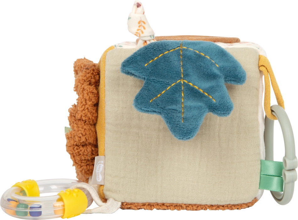 Ta wielofunkcyjna materiałowa kostka z lwiątkiem zaciekawi maluszki różnorodnymi fakturami, dźwiękami i kształtami. Każda strona dostarcza innego bodźca – od delikatnego dzwonienia dzwoneczka, przez grzechotanie koralików, po szeleszczące powierzchnie i bezpieczny gryzak, który przynosi ulgę podczas ząbkowania.