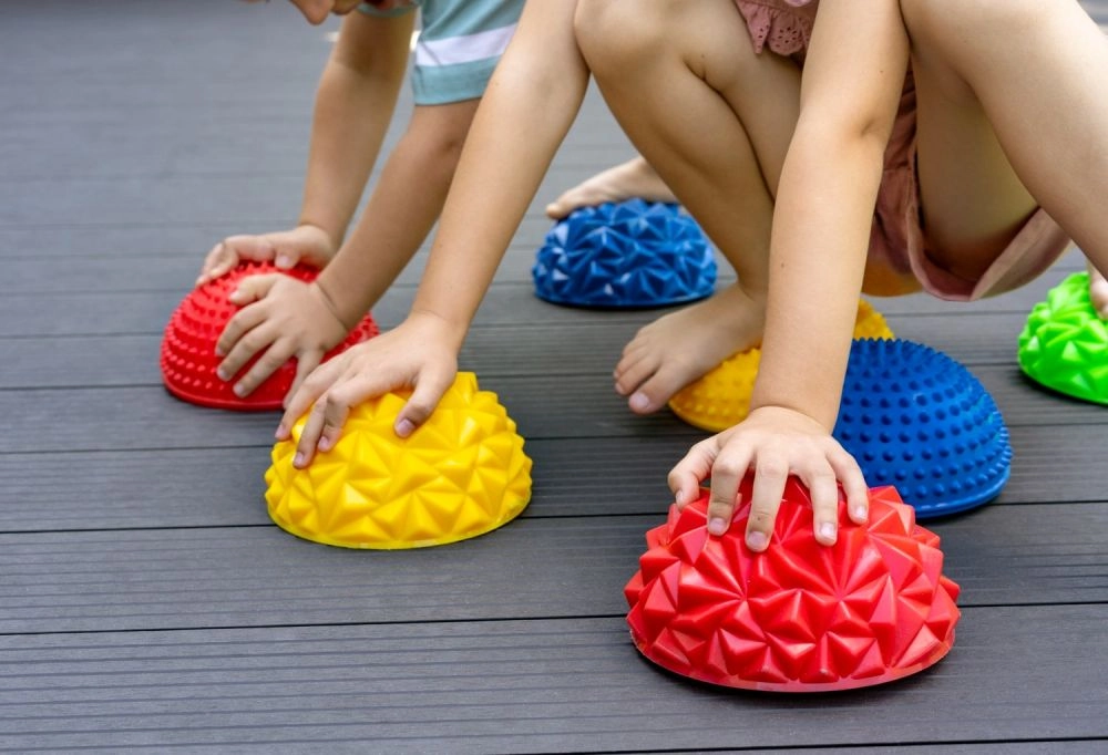 Gęste wypustki masujące aktywują receptory na stopach i dłoniach, wspierają krążenie i zwiększają propriocepcję dla lepszej równowagi oraz pewności ruchu.