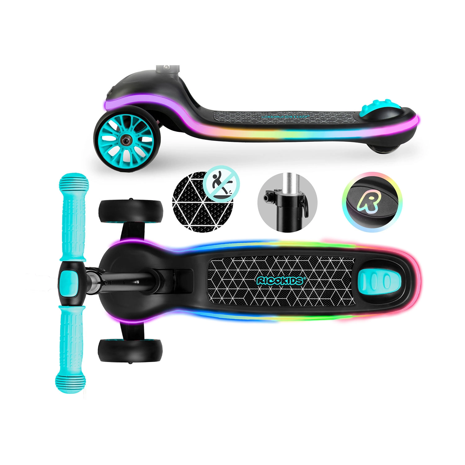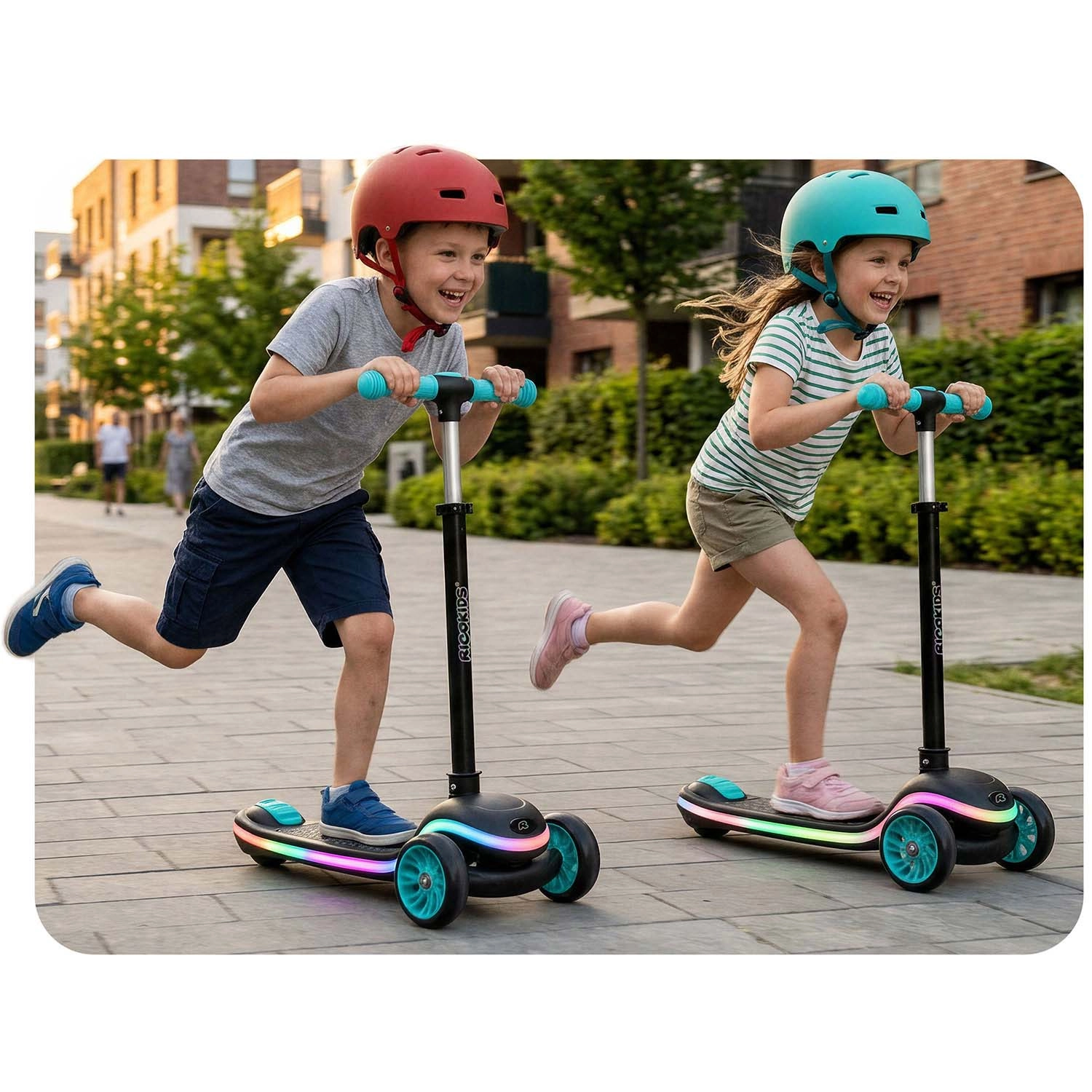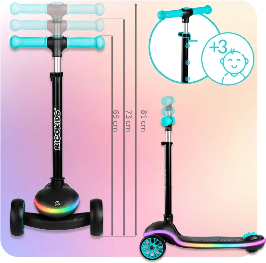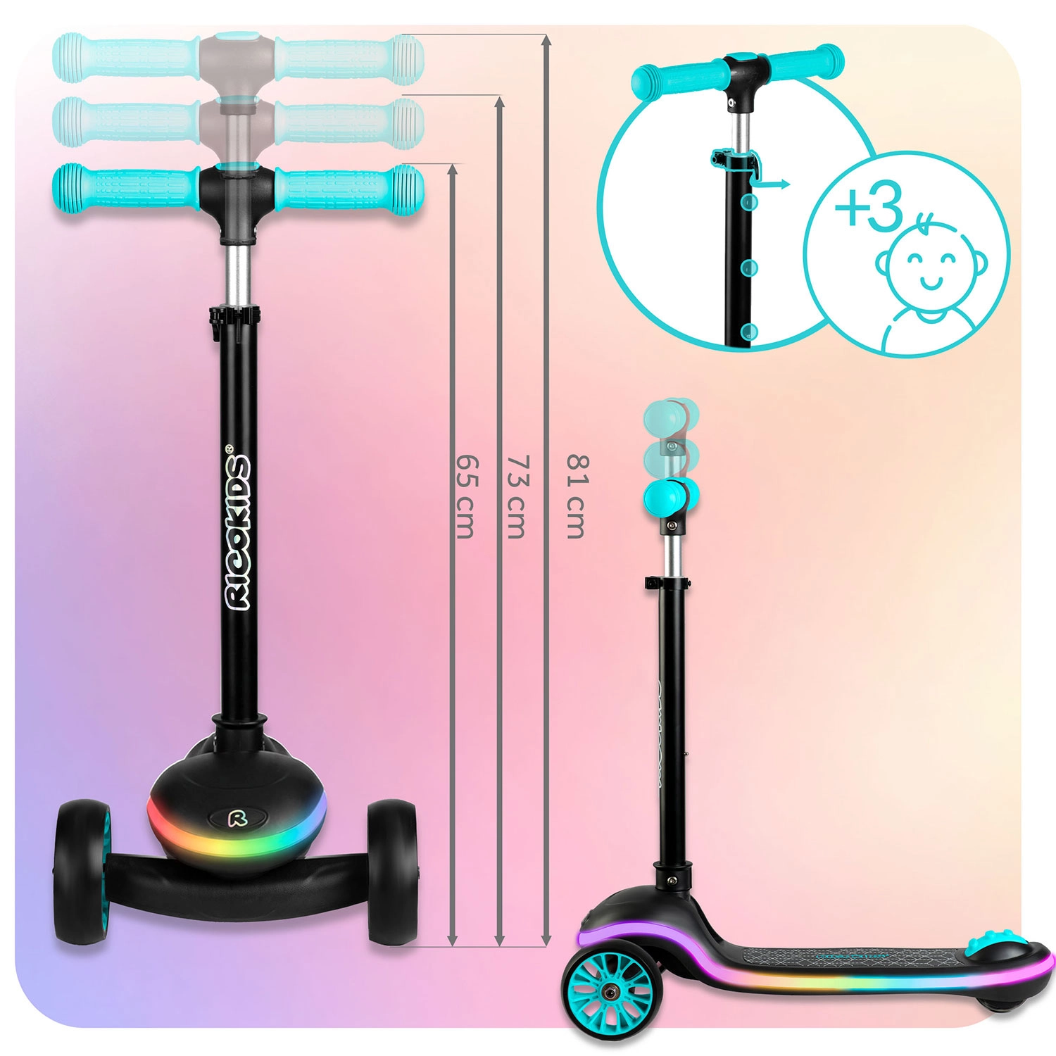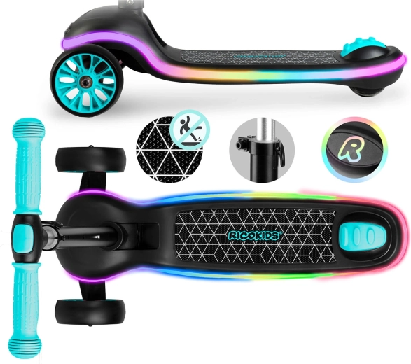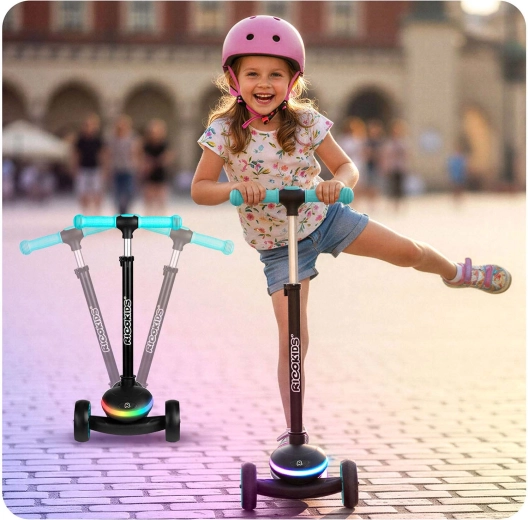 Ricokids Leddi to stylowa i wytrzymała trójkołowa hulajnoga, która zachwyci dzieci świecącym podestem, a rodziców ucieszy solidną konstrukcją i prostą obsługą. Dwa przednie koła zwiększają stabilność, lean‑to‑steer (sterowanie przechyłem) wspiera rozwój równowagi i koordynacji. Świetnie wygląda, jest wygodna i bezpieczna – idealny towarzysz na każdy dzień.