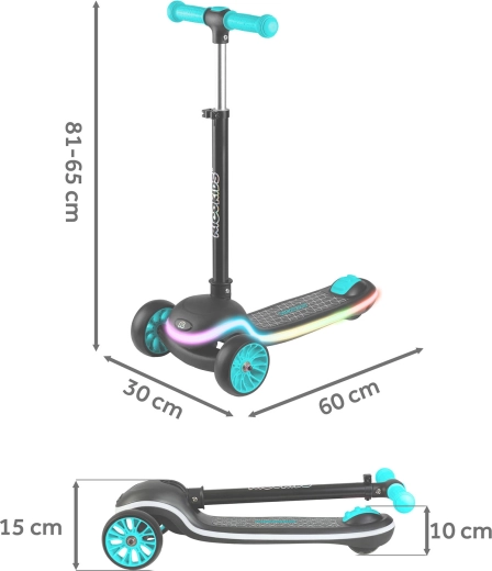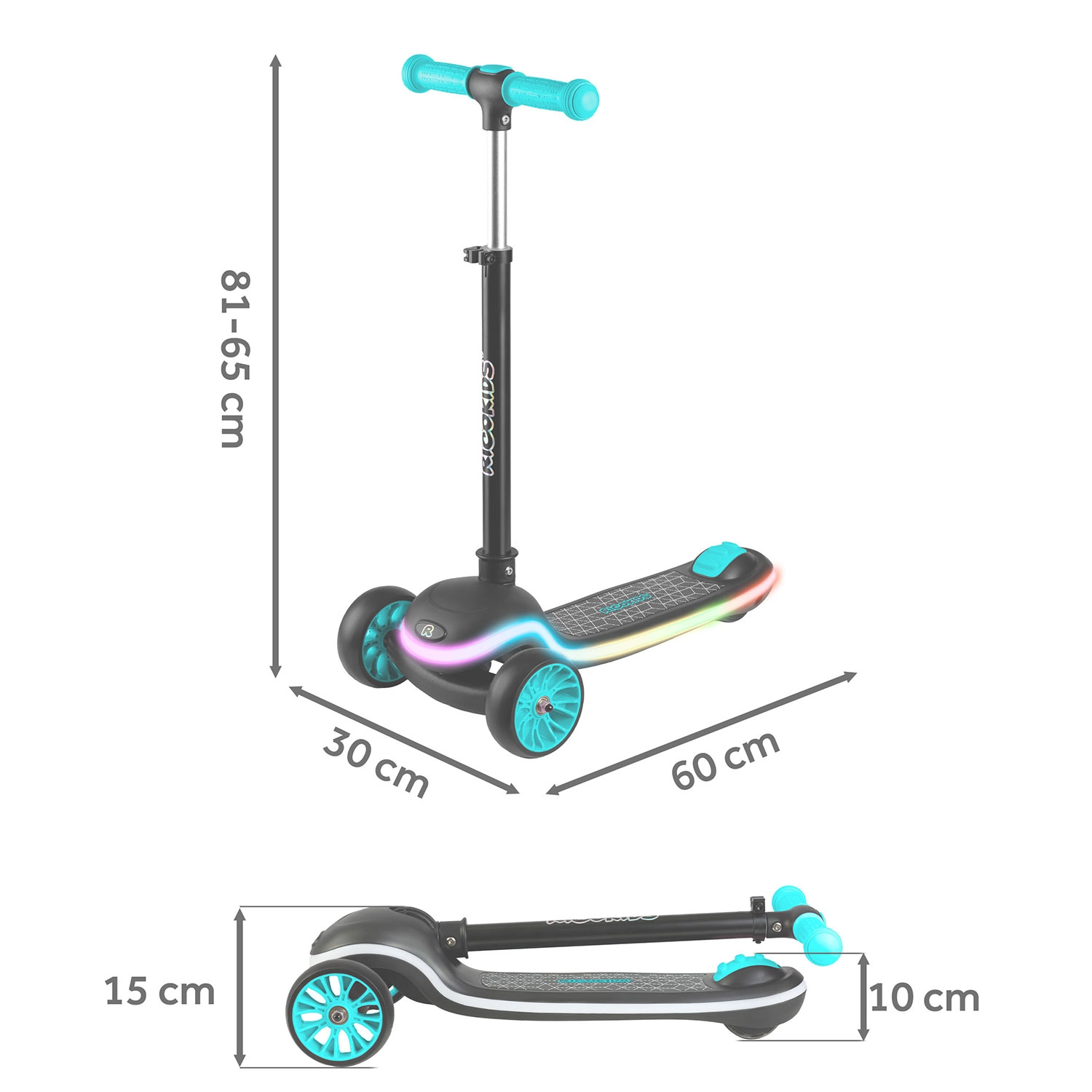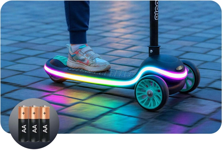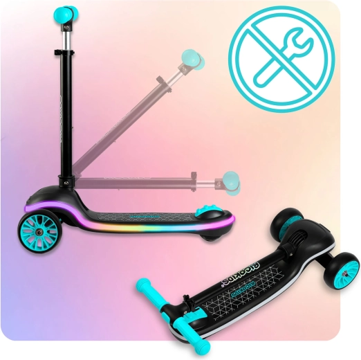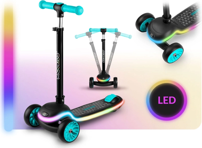 Hulajnoga składa się w sekundę, a po złożeniu zajmuje minimum miejsca. 3‑stopniowa regulacja wysokości kierownicy zapewnia idealne dopasowanie do rosnących dzieci już od ok. 3 lat. Antypoślizgowe gripy, szeroki podest i tylny hamulec nożny dają pewność podczas jazdy i hamowania. Panel LED oferuje do 20 trybów świetlnych – jednokolorowe i wielokolorowe efekty z płynnymi przejściami dla efektownej jazdy także po zmroku.