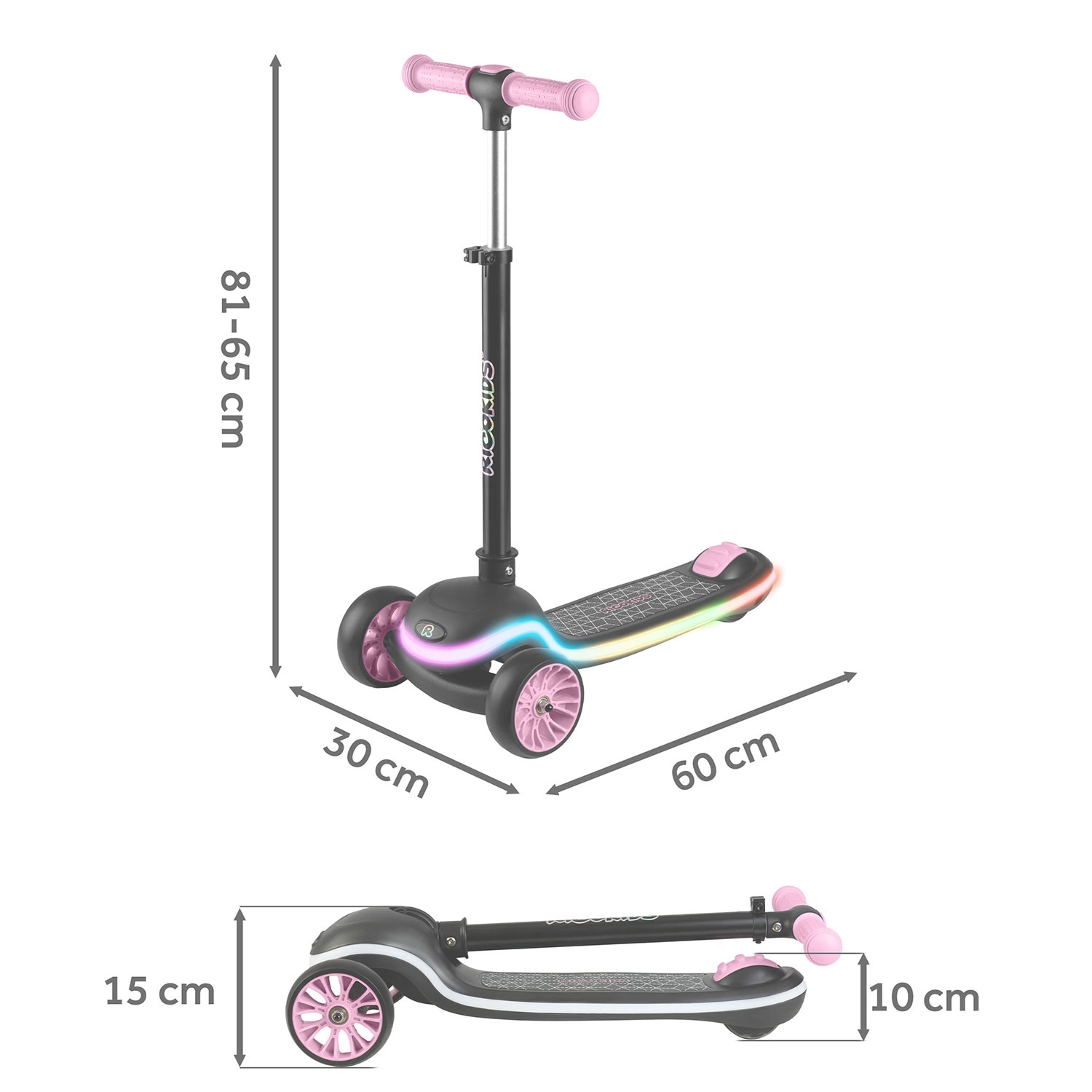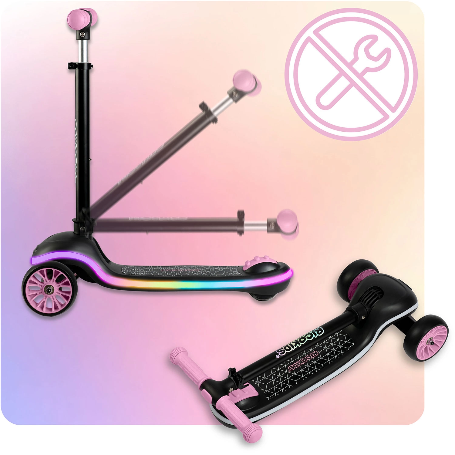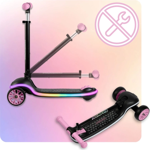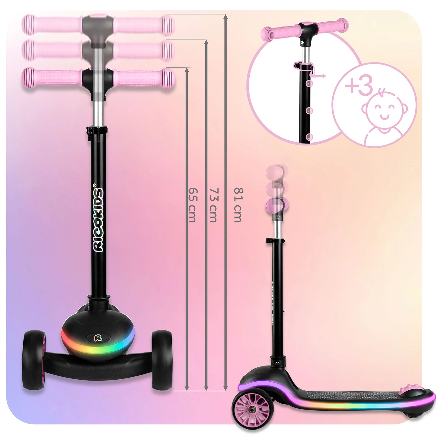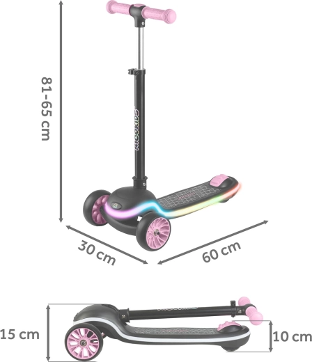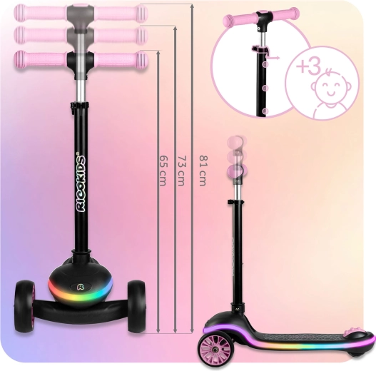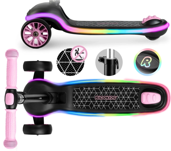 Lekka i stabilna dziecięca hulajnoga RICOKIDS Leddi zapewnia zabawę pełną świateł dzięki podświetlanemu LED podestowi z 20 trybami. Sterowanie balansowe z dwoma przednimi kółkami wspiera koordynację, szeroki, antypoślizgowy podest zapewnia pewność, a 3‑stopniowo regulowana kierownica rośnie razem z dzieckiem. Praktyczne szybkie składanie jednym ruchem ułatwia przenoszenie i przechowywanie.