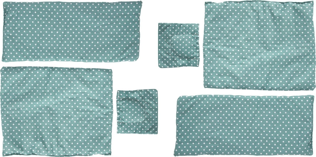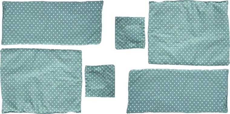 W opakowaniu znajdują się miękkie poduszki, kołderki i prześcieradła w dopasowanym, groszkowym wzorze.