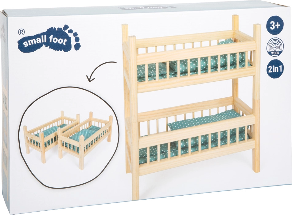 Uniwersalne drewniane łóżeczko dla lalek SMALL FOOT to idealny wybór do kreatywnej zabawy dzieci. Dzięki wysokiej jakości wykonania i naturalnemu wyglądowi świetnie wpasuje się w każdy dziecięcy pokój. Koncepcja 2 w 1 pozwala używać łóżka jako piętrowego dla podwójnej dawki zabawy albo rozdzielić je na dwa łóżka, by bawić się z kilkoma lalkami jednocześnie.