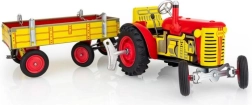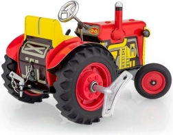 Klasyczna blaszana zabawka dla małych i dużych fanów techniki rolniczej: traktor Zetor z odczepianą przyczepą na sprężynowy mechanizm na kluczyk. Oferuje 3 biegi (do przodu, neutralny, wsteczny), działające sterowanie kierownicą oraz hamulec ręczny. Precyzyjne czeskie rzemiosło, certyfikat Bezpiecznej Zabawki i wytrzymała konstrukcja z nadrukowanej blachy uzupełniona plastikowymi kołami.