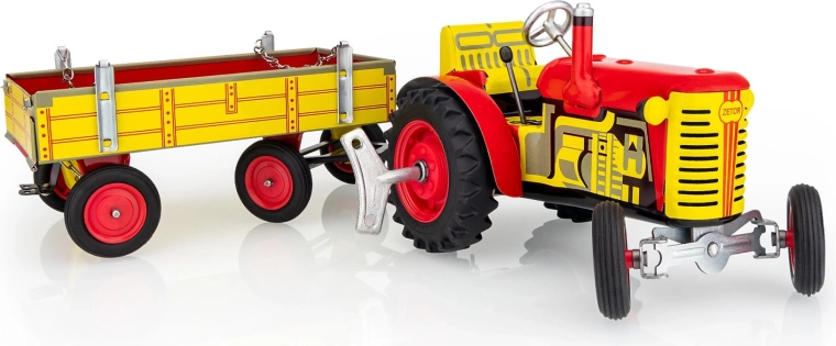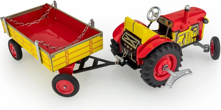 Klasyczna blaszana zabawka dla małych i dużych fanów techniki rolniczej: traktor Zetor z odczepianą przyczepą na sprężynowy mechanizm na kluczyk. Oferuje 3 biegi (do przodu, neutralny, wsteczny), działające sterowanie kierownicą oraz hamulec ręczny. Precyzyjne czeskie rzemiosło, certyfikat Bezpiecznej Zabawki i wytrzymała konstrukcja z nadrukowanej blachy uzupełniona plastikowymi kołami.