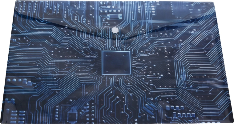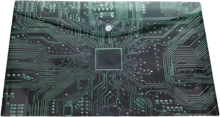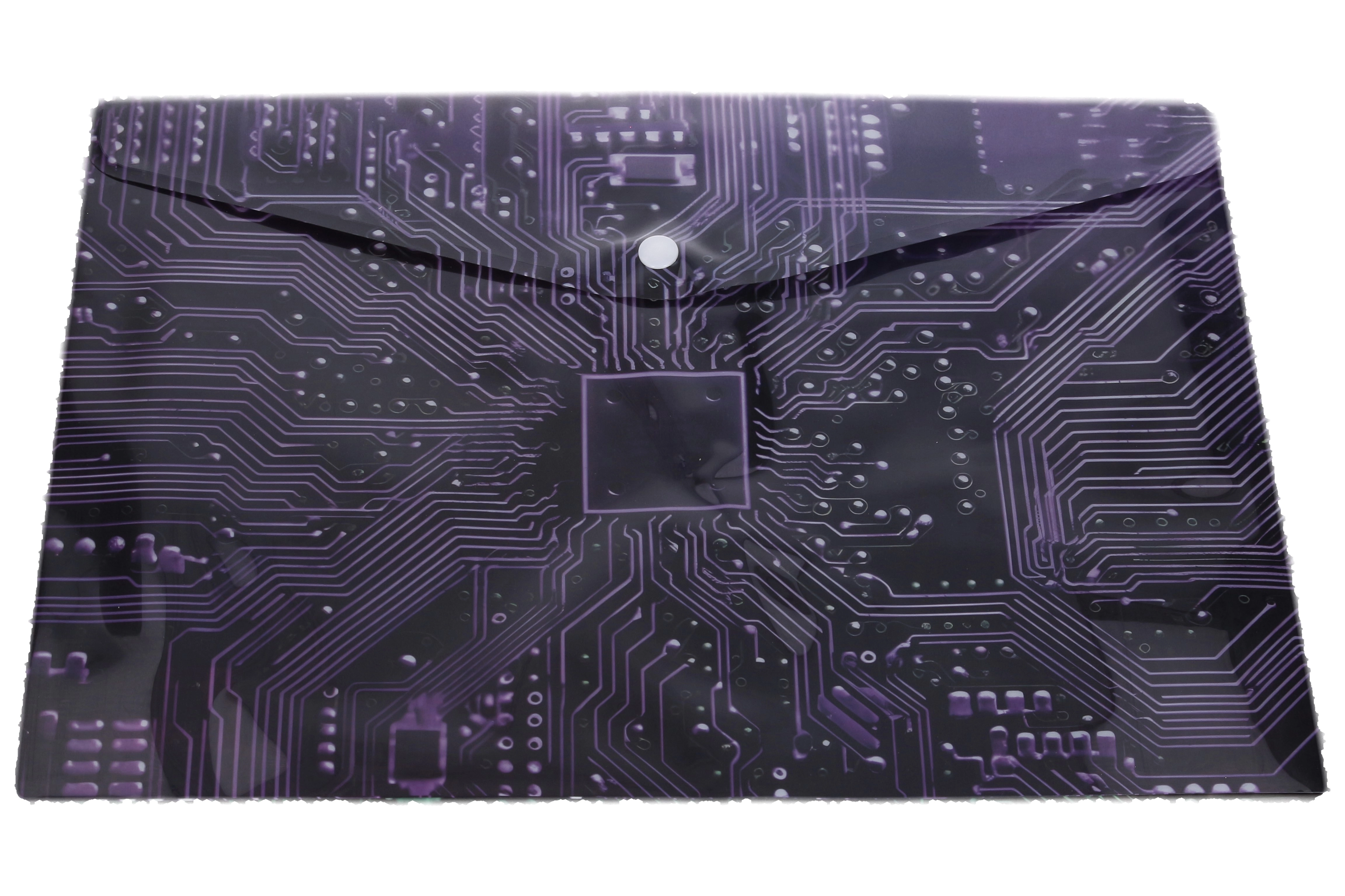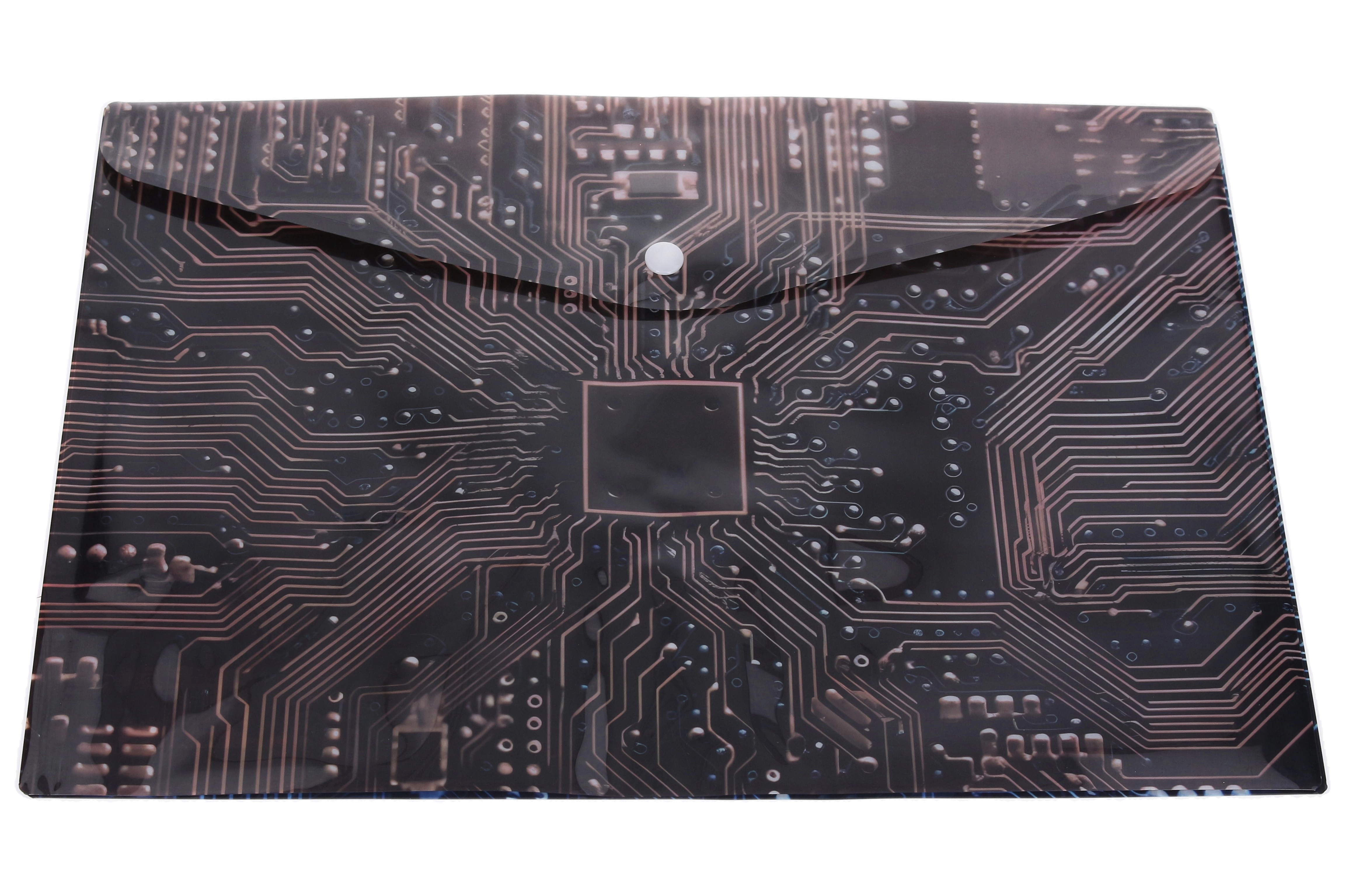 Praktyczna koperta z bezpiecznym zatrzaskiem jest idealna do przechowywania mniejszych dokumentów, biletów, kart, karteczek czy fotografii. Półprzezroczysty materiał umożliwia szybką orientację w zawartości, a nowoczesny wzór PCB (płyta główna) nadaje oryginalny wygląd.