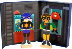 Ta pomysłowa magnetyczna układanka zapewnia dzieciom godziny zabawy i nieskończone możliwości komponowania. Z 27 magnesów stworzysz ponad 80 różnych kostiumów – od odważnych superbohaterów po zwariowane wariacje, które pobudzą dziecięcą wyobraźnię. Dwie duże figurki można umieścić w dołączonych drewnianych podstawkach, dzięki czemu dzieci mogą nie tylko bawić się przy stole, ale też eksponować swoje dzieła.