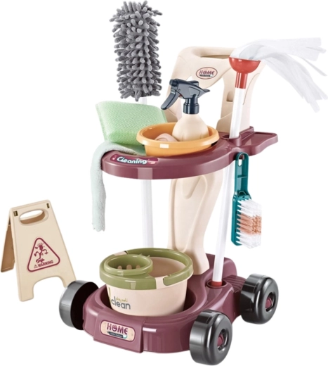 - wózek do sprzątania, wiadro, mop, mała szczotka, ściereczki, spryskiwacz, zmiotka i szufelka, duża szczotka i szufelka, dziecięcy odkurzacz, miska, wieszak na akcesoria, tabliczka ostrzegawcza