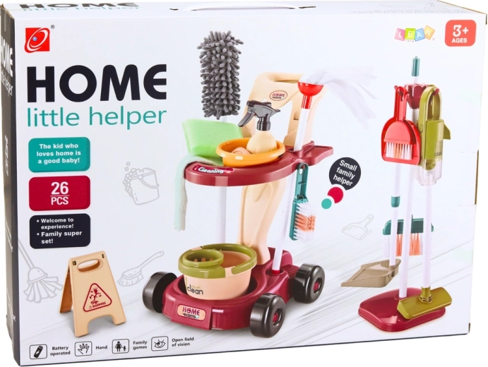 - 26 elementów dla urozmaiconej zabawy: wózek, wiadro z mopem, odkurzacz, szczotki, zmiotki, sznurki, ściereczki i inne.