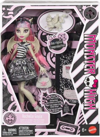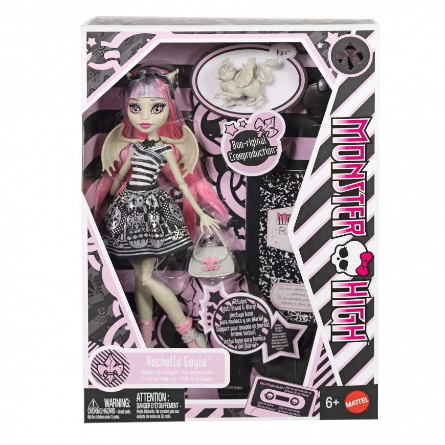 Wróć do świata Monster High wraz z powrotem kultowej postaci Rochelle Goyle. Lalka wyróżnia się czarno-białym, paskowanym topem, metaliczną minisukienką i różowymi akcentami, które współgrają z jej długimi różowymi włosami. Dopracowany makijaż, akcesoria i ikoniczne skrzydła dopełniają unikalny „scarisowy” styl.