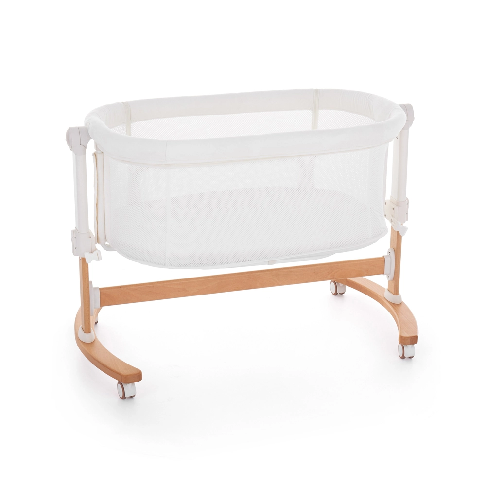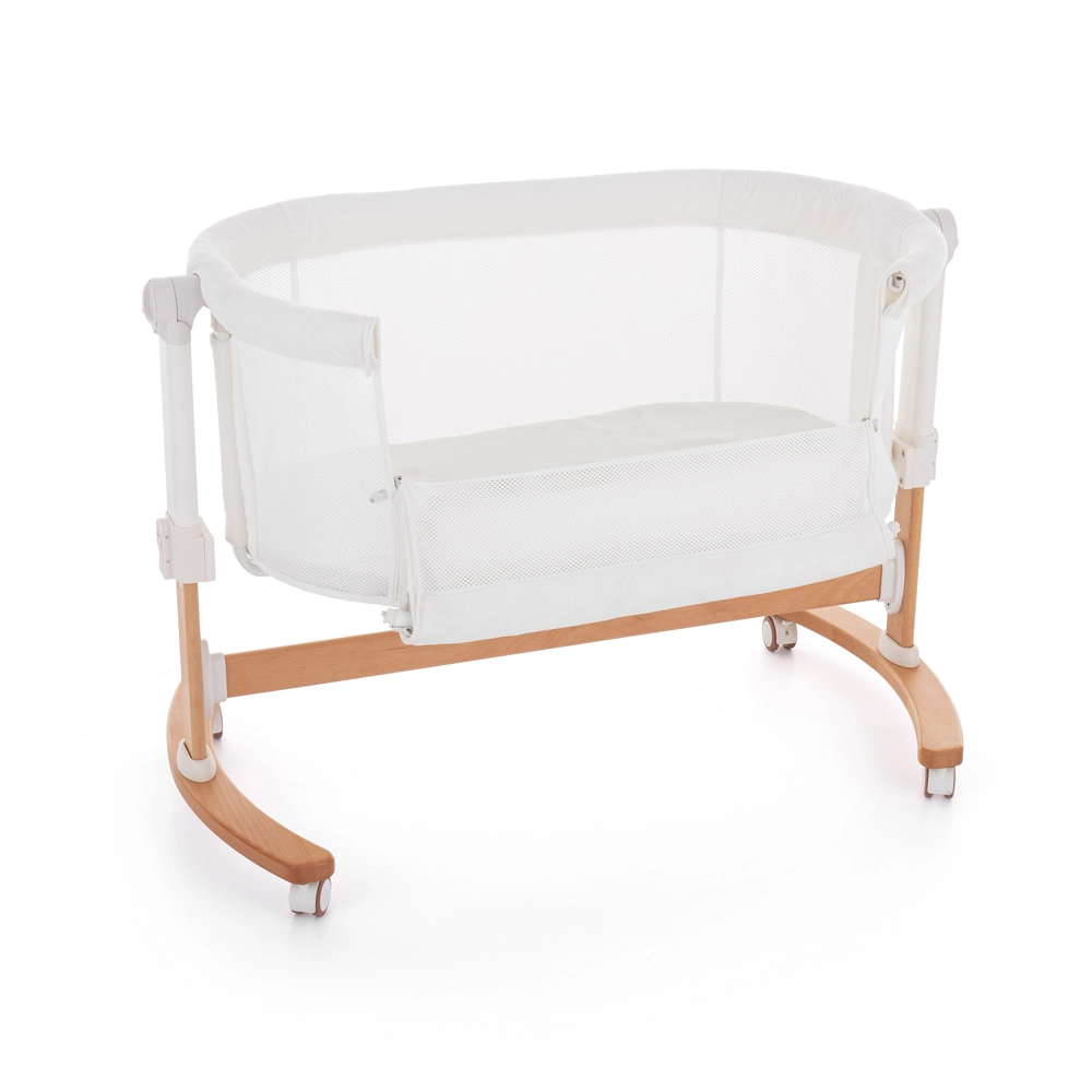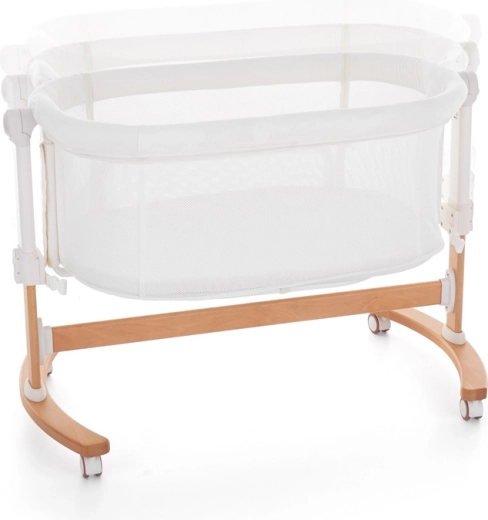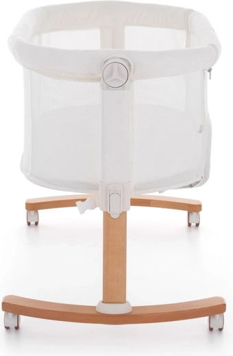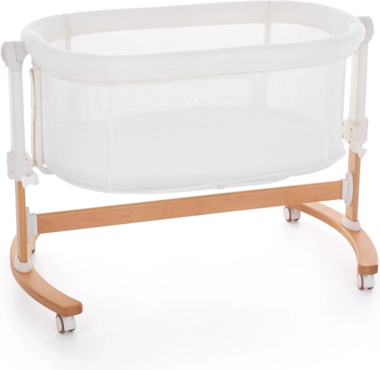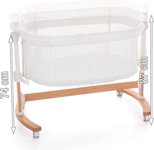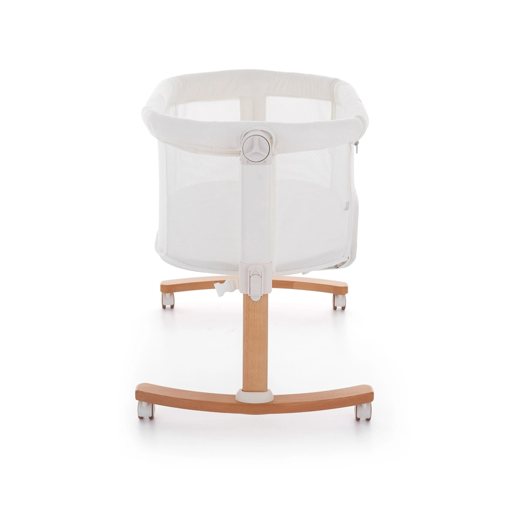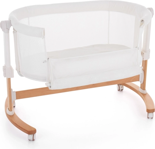 Stabilną ramę z bukowego drewna uzupełniają kółka z hamulcem, co ułatwia wygodne przenoszenie między pomieszczeniami. Zintegrowana funkcja kołyski pomoże delikatnie ukołysać maluszka do snu. W zestawie jest komfortowy materac z pokrowcem nadającym się do prania oraz torba do przenoszenia, ułatwiająca złożenie i przechowywanie łóżeczka.