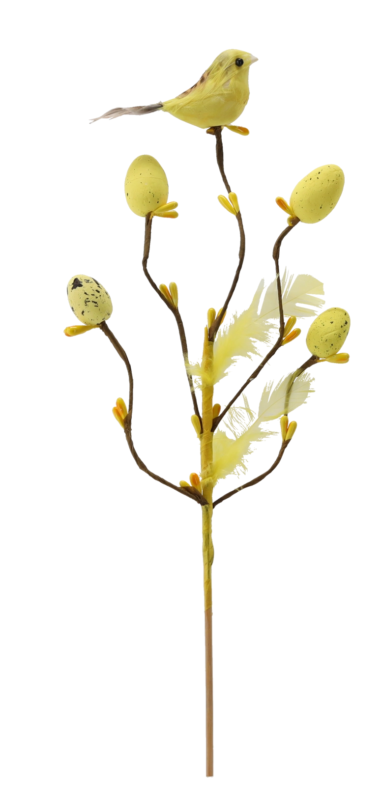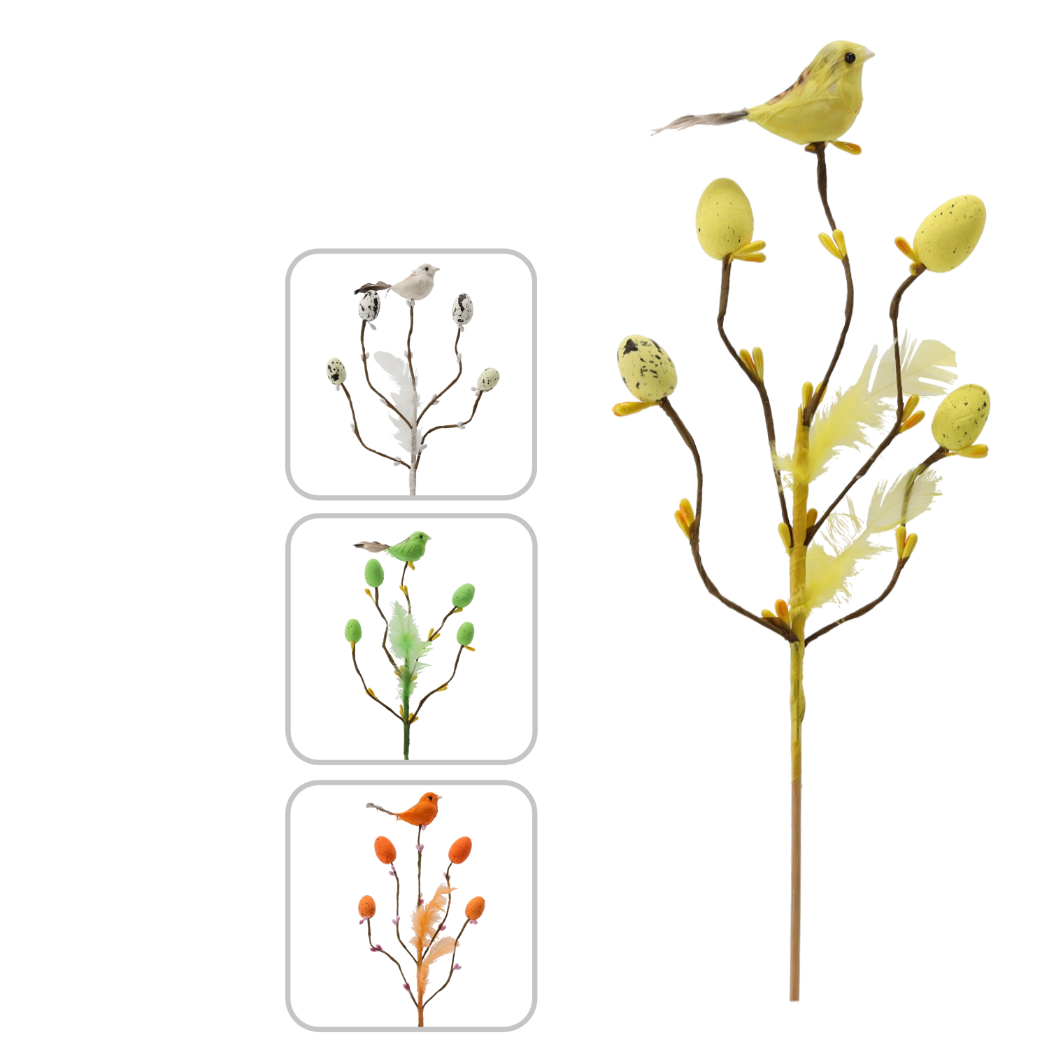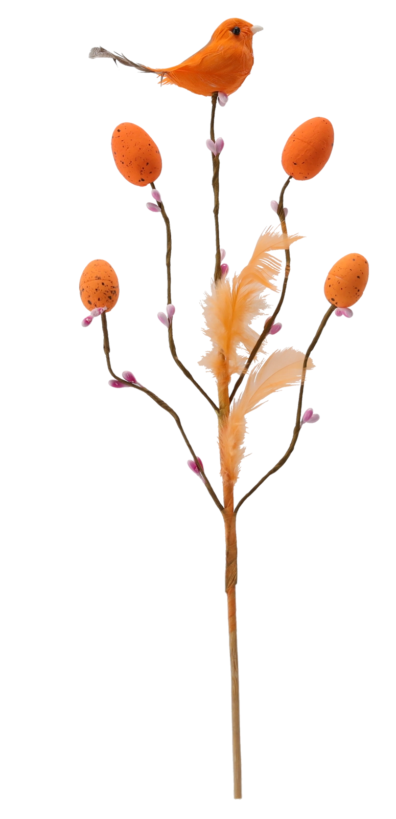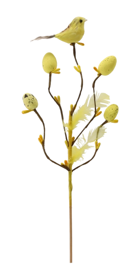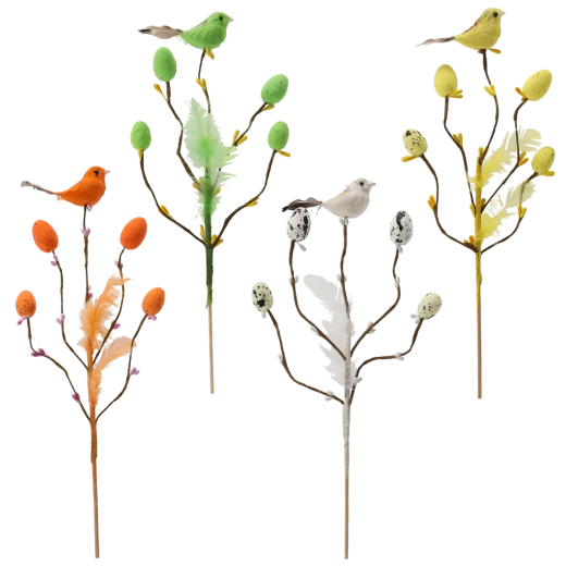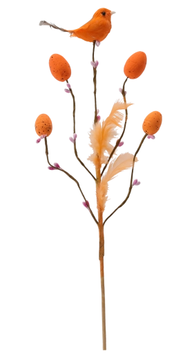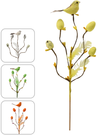 Ta stylowa wielkanocna dekoracja na piku wnosi do wnętrza świeżość i radość wiosny. Gałązka z drobnymi odnogami jest uzupełniona o ptaszka, delikatne piórka i jajeczka z nakrapianym wzorem, które wyglądają naturalnie i figlarnie. Dzięki subtelnej łodyżce łatwo wbijesz ją w kwiatowe aranżacje, dekoracje z mchu lub wstawisz do wąskiego wazonu.