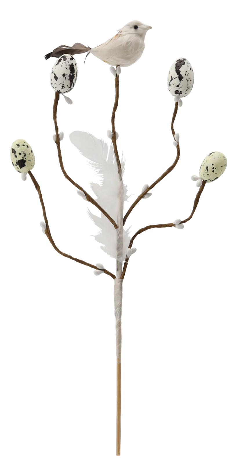 Dekorację uzupełniają nakrapiane jajeczka, delikatne piórka i mały ptaszek, które wyglądają naturalnie i dodają kompozycji życia.