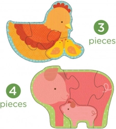 - Zestaw zawiera cztery różne układanki z ilością elementów od 3 do 6, co ułatwia stopniowe zwiększanie trudności.
