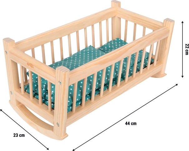 Ta naturalna drewniana kołyska to idealny dodatek do pokoju dziecięcego i domku dla lalek. Stabilna rama kołyski zapewnia płynne kołysanie, które uspokaja lalki i pluszowych przyjaciół o długości do 39 cm. W zestawie znajduje się dopasowana tekstylna wyprawka w delikatnym wzornictwie dla maksymalnego komfortu.