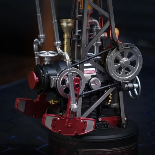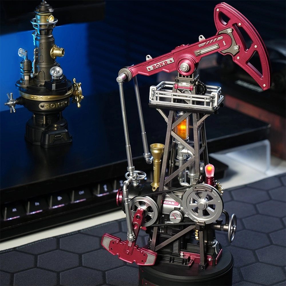 Ta mechaniczna układanka inspirowana historyczną maszyną wydobywczą typu pumpjack przenosi technikę prosto na Twój stół. Zaawansowany system kół zębatych, mechanizm korbowy, przeciwwaga i tłok zapewniają płynny i autentyczny ruch. Efekt LED w „kotle parowym” elegancko symuluje spalanie i podkreśla industrialną atmosferę.