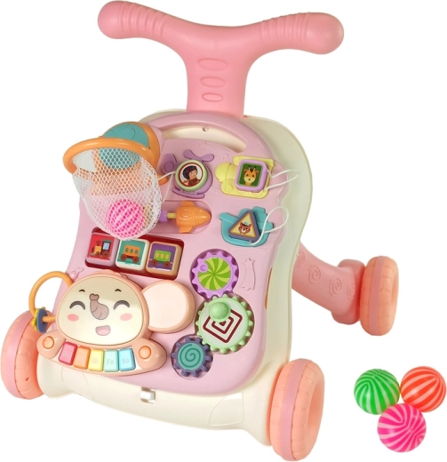 Różowy interaktywny chodzik i stolik do zabawy 2w1 wspiera pierwsze kroki, a jednocześnie rozwija zmysły i małą motorykę. Oferuje odpinany panel edukacyjny z pianinkiem, zębatkami, kształtami, koszykiem na piłeczki i obrotowymi kostkami. Dzięki możliwości zablokowania tylnych kółek oraz dociążenia zbiornika wodą zabawa jest bezpieczna i stabilna. Panel można odpiąć i używać samodzielnie w domu lub w podróży.