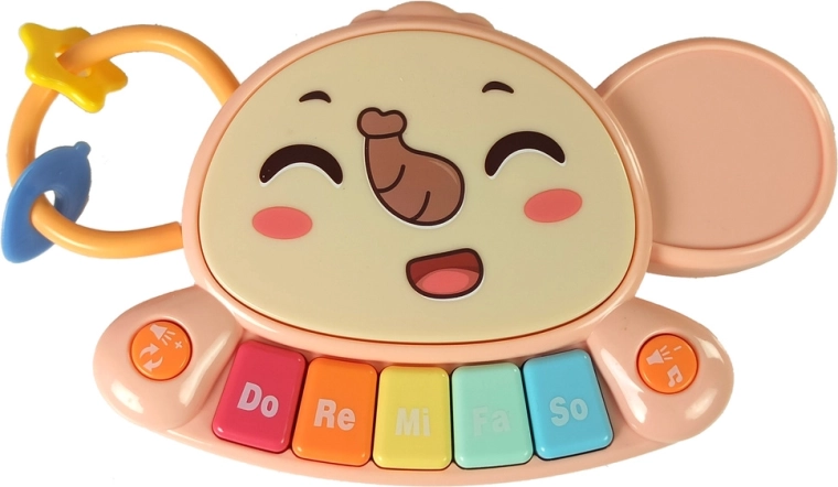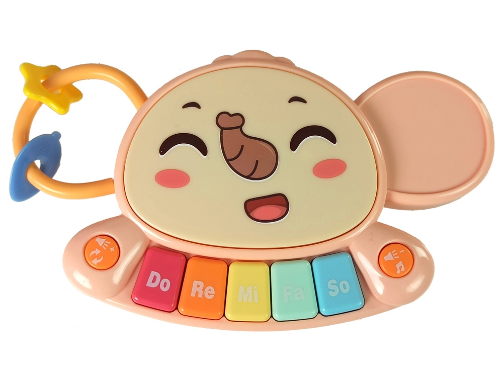 - kolorowe pianinko (Do–Re–Mi–Fa–So), 3 zębatki, kształty geometryczne na sznureczkach, koszyk i piłeczki, obrotowe kostki