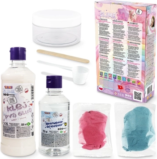 - 500 ml białego kleju PVA, 250 ml aktywatora, 25 g różowego puszystego piasku, 25 g niebieskiego puszystego piasku, szpatułka, miarka 50 ml, pojemnik do przechowywania