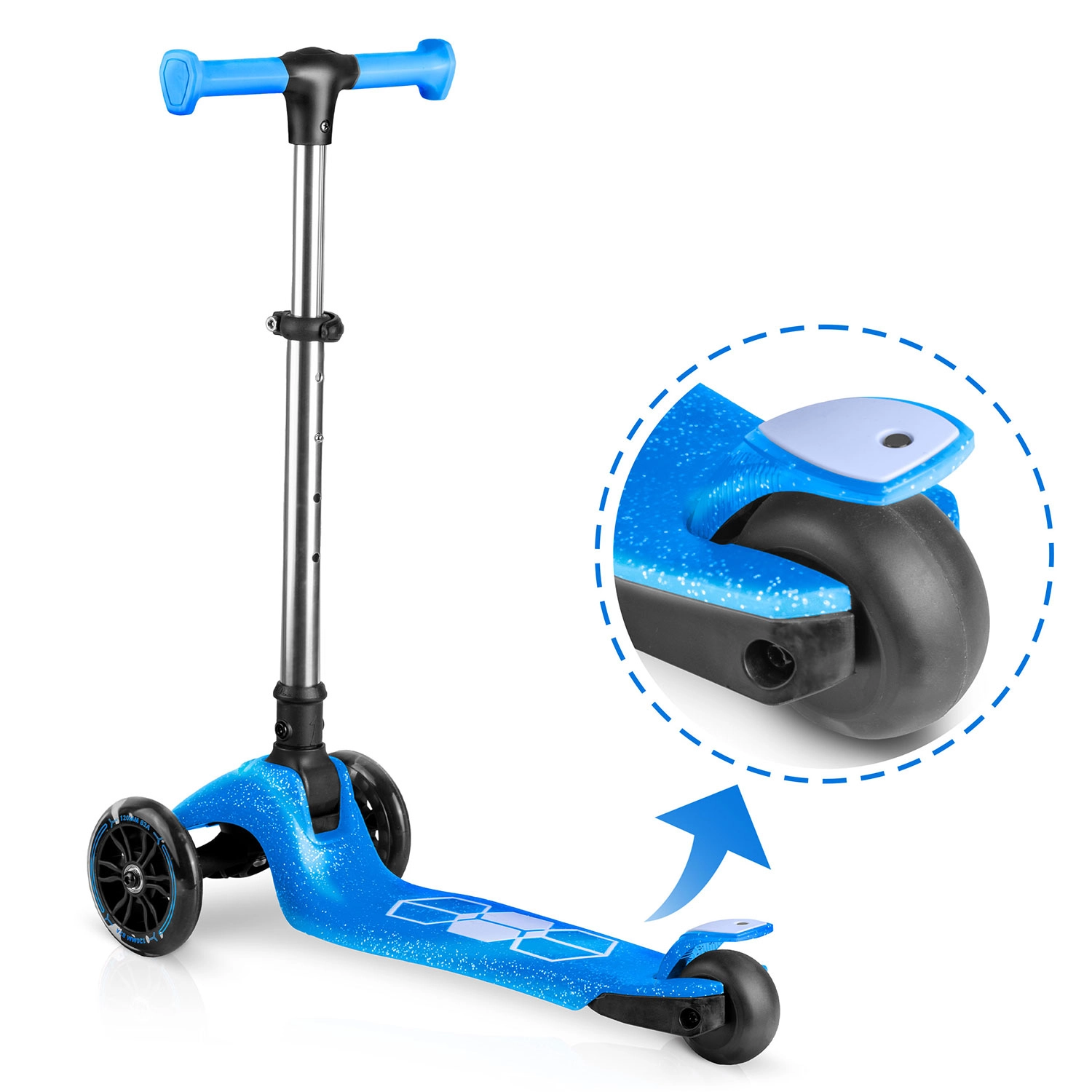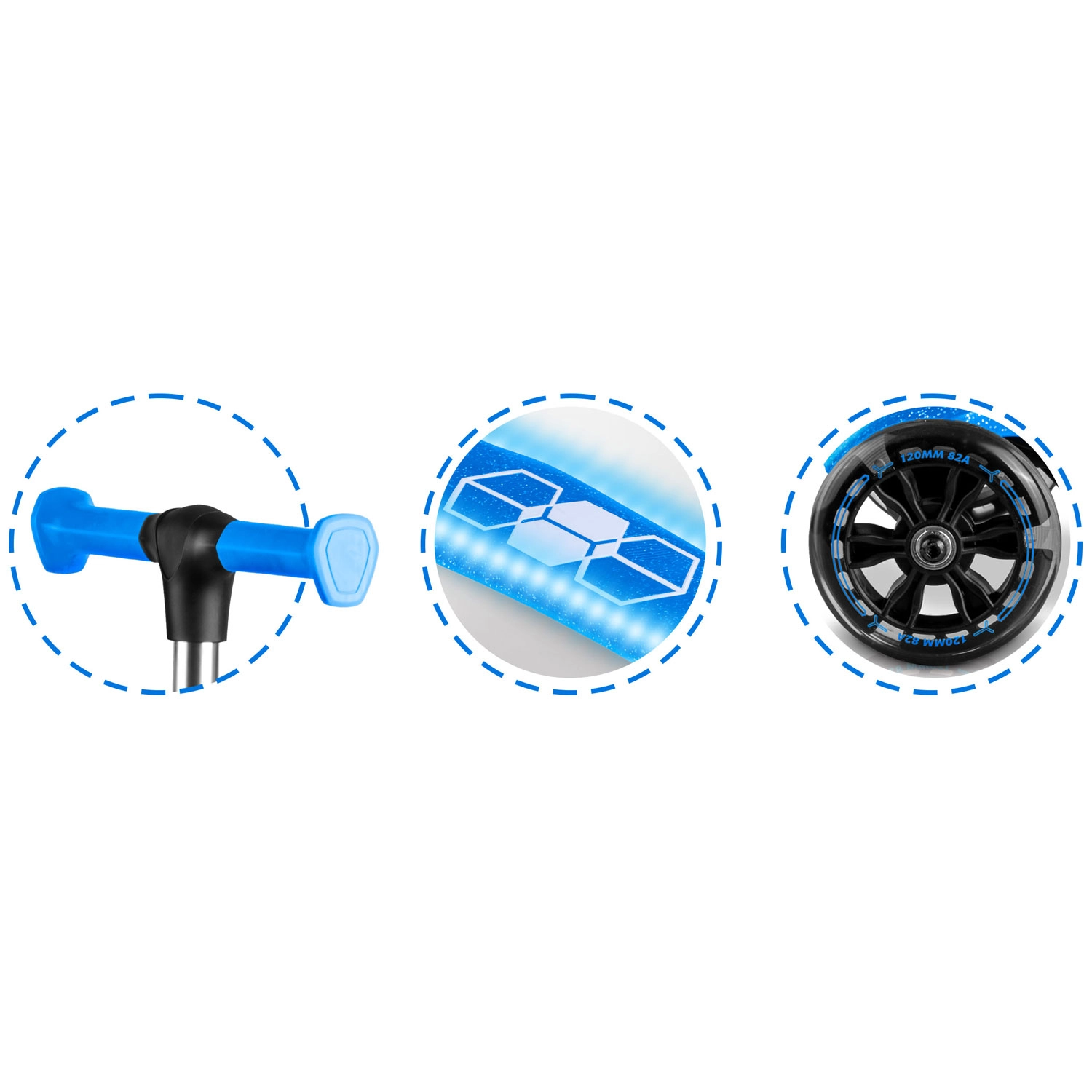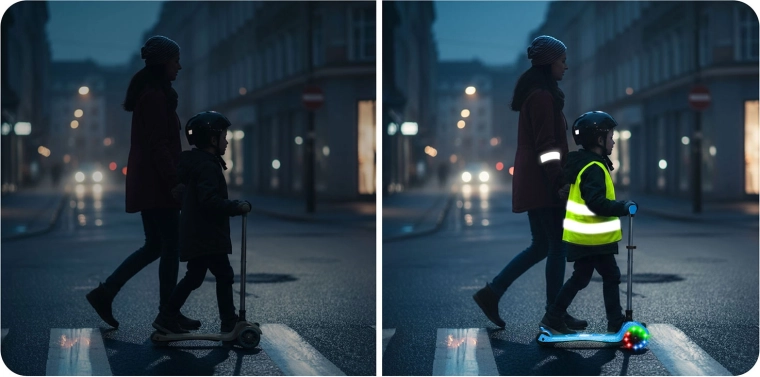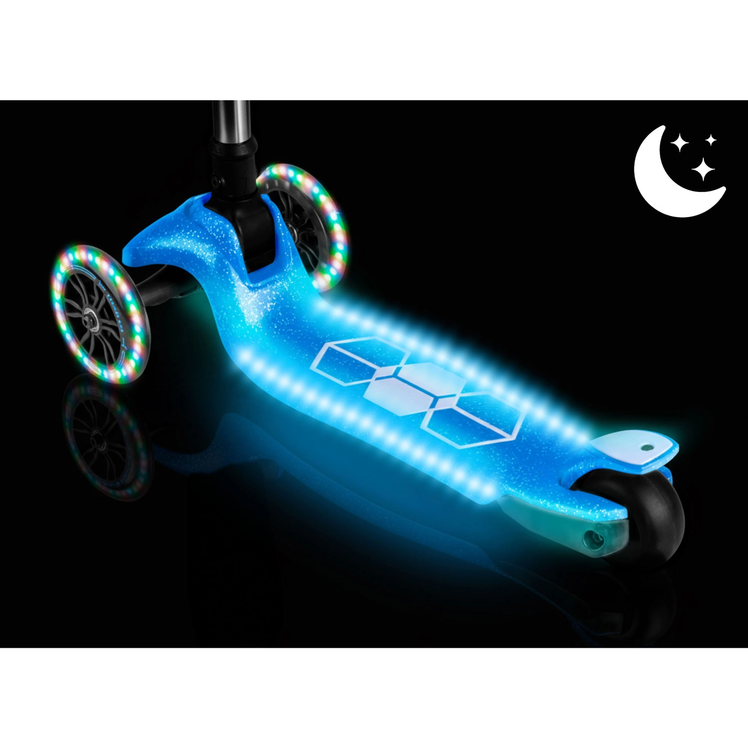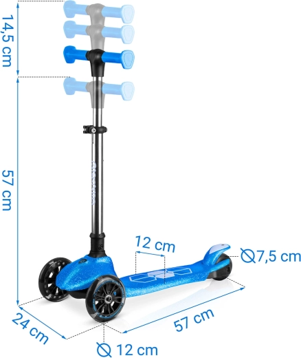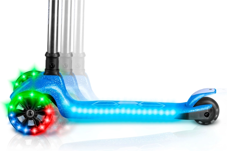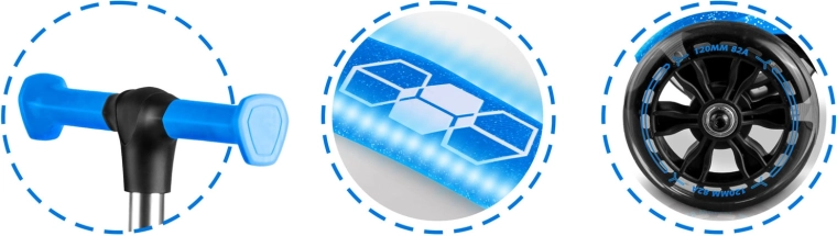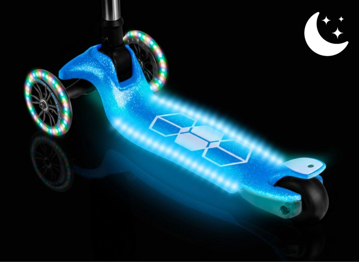 Zintegrowane oświetlenie LED w podeście oraz świecące przednie kółka z dynamem rozjaśniają każdą jazdę i poprawiają widoczność o zmierzchu. Regulowana aluminiowa kierownica łatwo „rośnie” z dzieckiem, dzięki czemu hulajnoga posłuży przez kilka sezonów. Solidna konstrukcja jest zaprojektowana do codziennego użytkowania i spełnia wymagania certyfikatu CE oraz EN71-1/2/3.