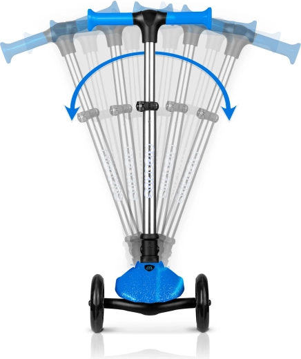 Trzystopniowa regulacja wysokości dopasowuje się do wzrostu dziecka. Tylni hamulec nożny zapewnia płynne i pewne zatrzymanie.