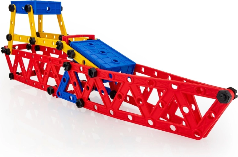 Dzięki zróżnicowanym elementom można tworzyć rozmaite konstrukcje – od dwupłatowca przez pojazdy aż po statki. Duże perforowane panele, łączniki i belki łatwo się ze sobą łączą, dlatego zestaw jest świetny zarówno dla początkujących, jak i dla małych konstruktorów, którzy chcą poznawać zasady mechaniki i podstawowe zjawiska fizyczne.