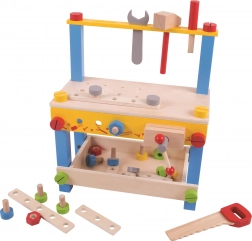 W zestawie znajduje się imadło, klucz, śrubokręt, młotek, piła, śruby i nakrętki, które można wielokrotnie składać i rozkładać. Stabilna konstrukcja i sprytne elementy do przechowywania pomagają utrzymać wszystko pod ręką i w porządku. Zestaw idealny do samodzielnej i wspólnej zabawy, wspiera cierpliwość i koncentrację.