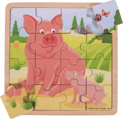 Pierwszy wspólny spacer świnki z prosiaczkiem na uroczym obrazku przyciąga uwagę dzieci od pierwszego spojrzenia. Puzzle z 16 elementami umieszczone są w ramie z podkładowym motywem, dzięki czemu początkujący mali układacze szybko się orientują i cieszą się radością z sukcesu. Elementy są wystarczająco duże i przyjemne w dziecięcej dłoni.