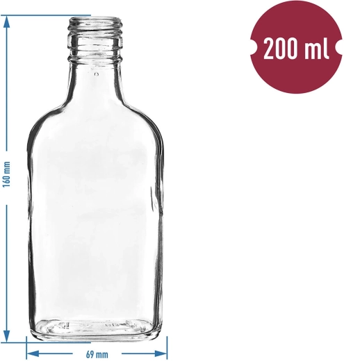 Ta przezroczysta szklana piersiówka łączy tradycyjny kształt z praktycznymi detalami do codziennego użytku. Świetnie sprawdzi się na domowe destylaty, likiery, oleje smakowe i syropy, a dzięki kompaktowym rozmiarom łatwo zabierzesz ją na wycieczki, pikniki lub jako stylowy prezent.