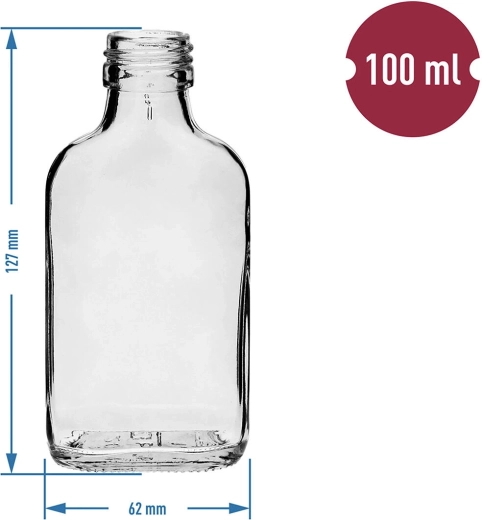 Kompaktowa szklana piersiówka o pojemności 100 ml jest idealna na alkohole, domowe destylaty lub syropy. Dzięki przezroczystemu szkłu zawsze masz wgląd w zawartość, a smukły kształt sprawia, że łatwo mieści się w kieszeni i plecaku – świetny towarzysz na wycieczki, biwakowanie i do serwowania w domu.