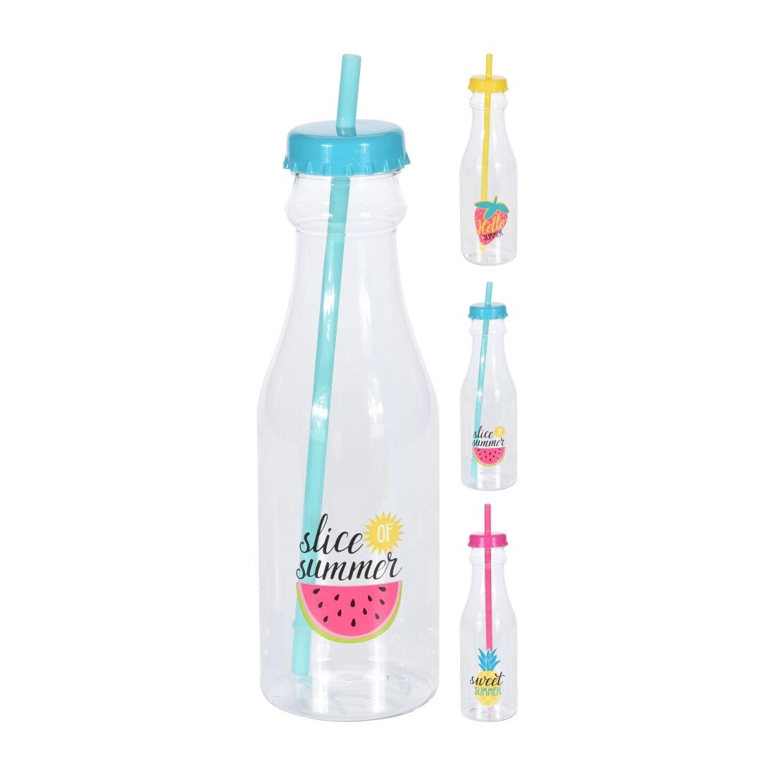 Ciesz się wygodnym piciem bez rozlewania. Ta przenośna butelka z wbudowaną słomką zapewnia maksymalny komfort podczas codziennego użytkowania. Dzięki kompaktowym wymiarom mieści się w uchwycie samochodowym i w plecaku, a nowoczesny design z pasami i letnimi motywami (grapefruit, aloha, summer living) doda Twojemu dniu świeżego stylu.