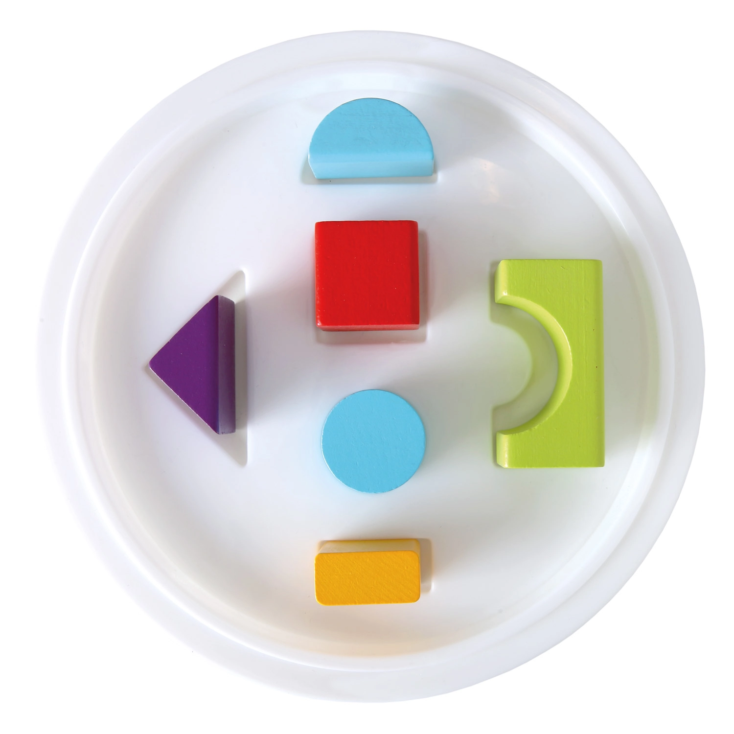 Opakowanie zamienia pokrywkę wiaderka w sortownicę. Dzieci w niewymuszony sposób trenują rozpoznawanie kształtów, koordynację i logiczne myślenie podczas odkładania klocków.