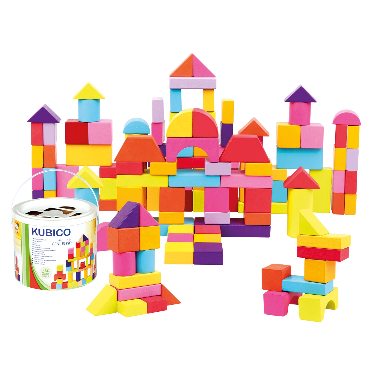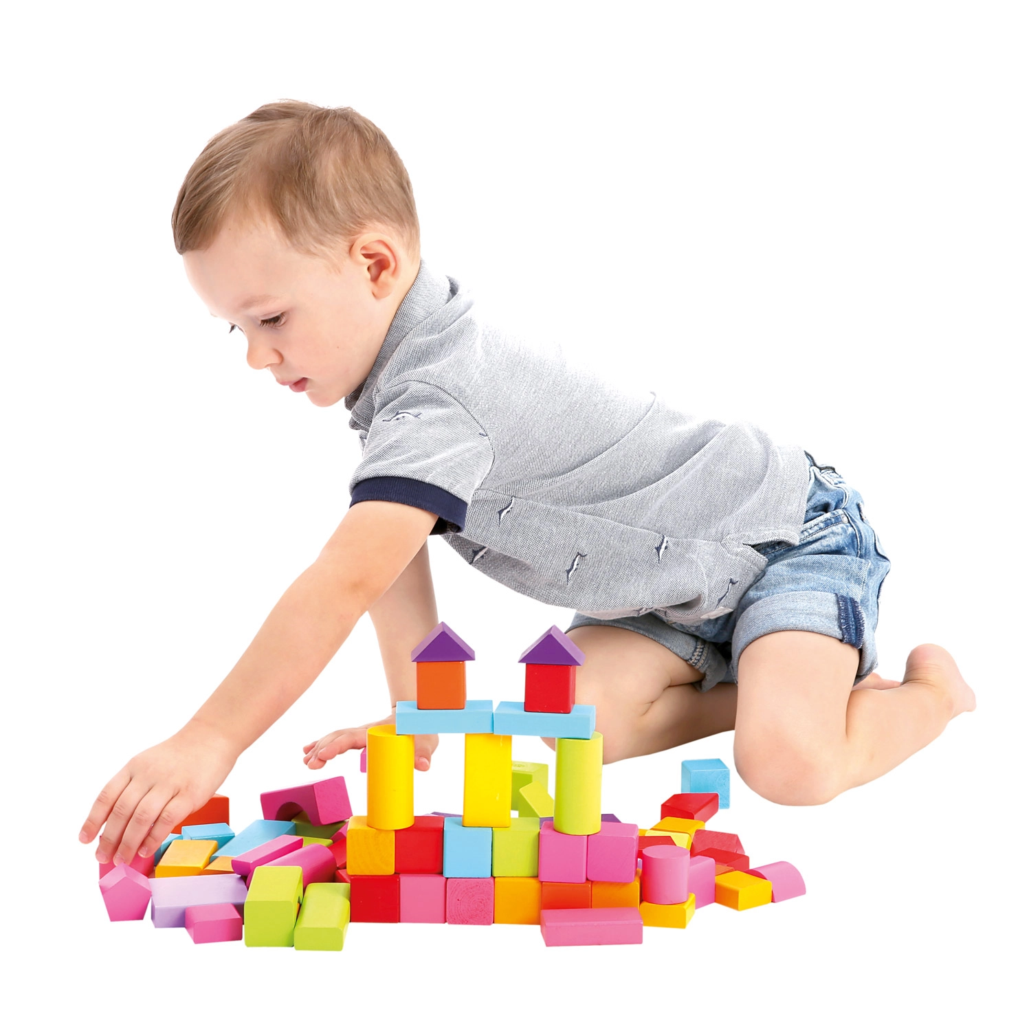 Idealny dla dzieci od 1 roku: klocki mają przyjemnie gładką powierzchnię, intensywne, bezpieczne kolory i zróżnicowane kształty – od sześcianów i prostopadłościanów po walce, łuki i trójkąty. Zabawa klockami wspiera rozwój percepcji przestrzennej, kreatywności oraz koordynacji oko–ręka.