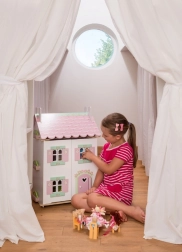 Domek dla lalek Sweetheart Cottage zachwyca detalami – motywami serduszek i kwiatów, pastelowymi tonami oraz przemyślanym układem pomieszczeń. Przednia część całkowicie się otwiera, dzięki czemu dzieci mają wygodny dostęp do wszystkich pokoi, a po uniesieniu części dachu odkryją przytulne poddasze.