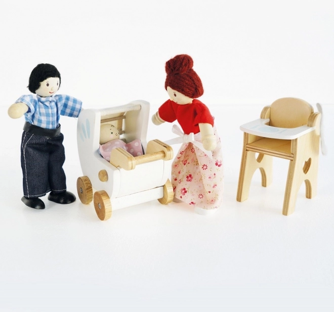 Uroczy drewniany zestaw do pomysłowej zabawy z niemowlęciem od marki LE TOY VAN. Zawiera wózek, wysokie krzesełko do karmienia, zestaw obiadowy i torbę. Tekstylne dodatki są szyte ręcznie, a wszystkie elementy wykonano z wysokiej jakości drewna kauczukowego. Zabawka jest zdobiona nietoksyjnymi farbami na bazie wody, jest wyprodukowana etycznie i wspiera kreatywność, małą motorykę oraz koordynację.