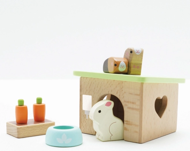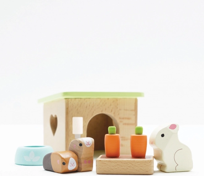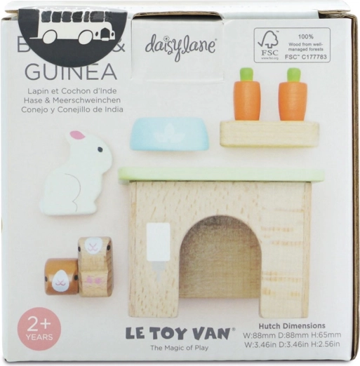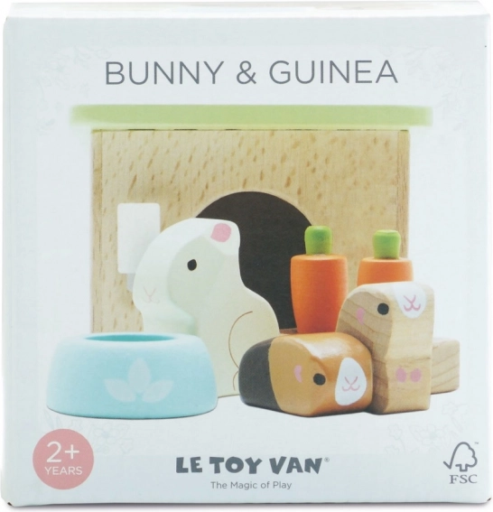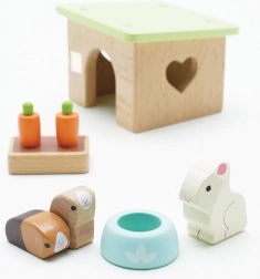 Uroczy drewniany zestaw domowych pupili od LE TOY VAN zawiera króliczka, dwie świnki morskie, budkę, miskę oraz marchewkowe przekąski na godziny kreatywnej zabawy w odgrywanie ról. Wykonany z zrównoważonego drewna FSC, ręcznie wykończony nietoksycznymi farbami na bazie wody – bezpieczny i stylowy wybór dla dzieci od 2 lat.