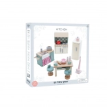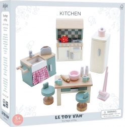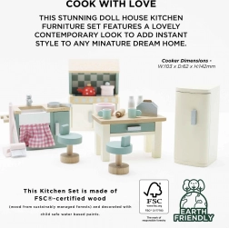 Idealna kuchnia do domku dla lalek od Le Toy Van. Ten piękny drewniany zestaw zawiera wszystko, czego potrzebujesz do miniaturowych kulinarnych przygód - zlewozmywak, kuchenkę, piekarnik, lodówkę i stół z krzesłami. Wszystko ręcznie wykonane z odnawialnych materiałów.
