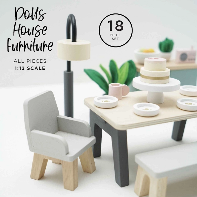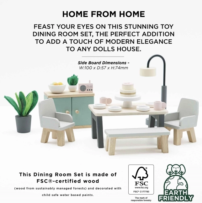 Doskonały drewniany zestaw jadalniany do domku dla lalek, który łączy nowoczesną elegancję z zrównoważonym projektem marki Le Toy Van. Idealny do rozwijania dziecięcej wyobraźni.