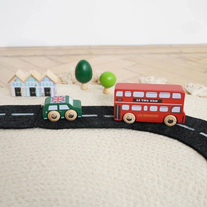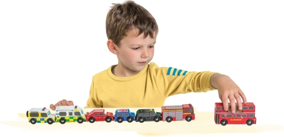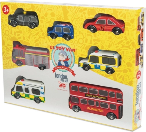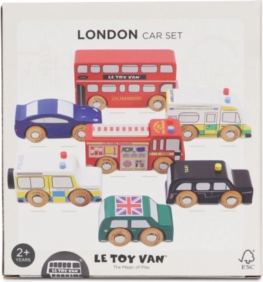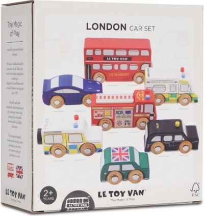 Odkryj świat tętniących życiem londyńskich ulic z dopracowanymi w detalach drewnianymi pojazdami od Le Toy Van. Zestaw obejmuje dwupiętrowy autobus, czarną taksówkę, wóz strażacki, karetkę, radiowóz oraz dwa samochody osobowe. Solidne wykonanie z trwałego, zrównoważonego drewna kauczukowego i gładkie krawędzie są idealne dla małych rączek, które podczas zabawy ćwiczą chwyt, koordynację ręka–oko i wyobraźnię.