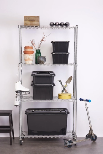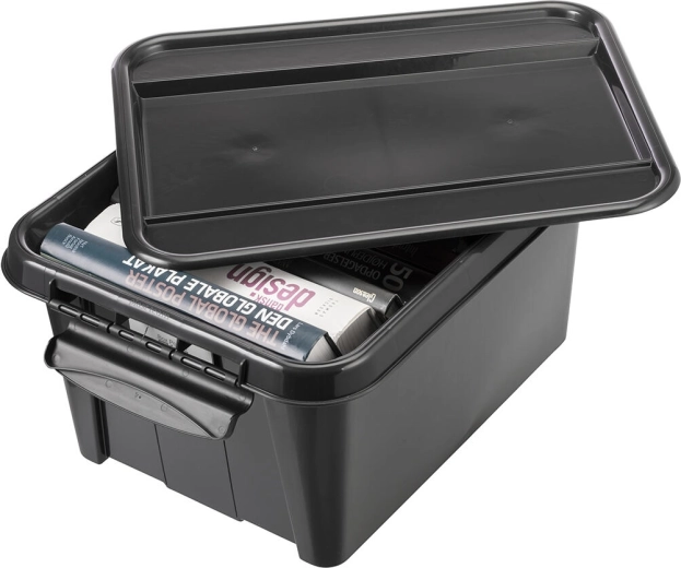 Utrzymaj porządek dzięki wytrzymałemu pojemnikowi z recyklingowanego polipropylenu. Dzięki pojemności 32 litrów i wymiarom 51 × 39 × 25,8 cm mieści małe i średniej wielkości przedmioty. Solidna pokrywa i 2 mocne klipsy zapewniają bezpieczne zamknięcie i ochronę zawartości przed kurzem.