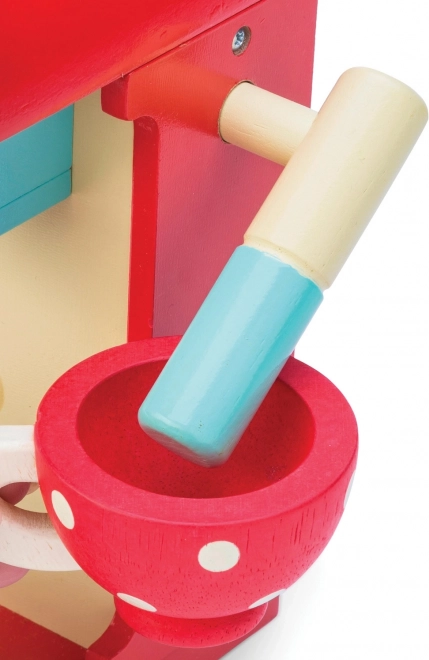 Wkładaj drewniane kapsuły do dźwigni, „zaparzaj” kawę do kubeczka i baw się w prawdziwego baristę. Interaktywne elementy pobudzają wyobraźnię i wspierają małą motorykę.