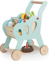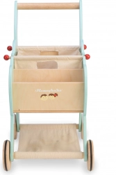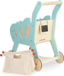 Stylowy drewniany wózek sklepowy LE TOY VAN w pastelowym błękicie pobudza zabawy w odgrywanie ról, rozwija motorykę małą oraz umiejętności społeczne. Oferuje dwie wewnętrzne przegródki, dolną przestrzeń do przechowywania, materiałową torbę oraz małą tabliczkę na listę zakupów. Wykonany z drewna certyfikowanego FSC, bezpiecznie zaokrąglony, ręcznie domalowywany nietoksycznymi farbami na bazie wody.
