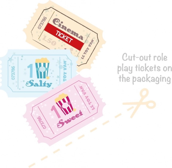 W zestawie bilety do kina i kartoniki „słodki/słony” popcorn, które rozwijają mowę, umiejętności poznawcze oraz zabawę w odgrywanie ról z rówieśnikami.
