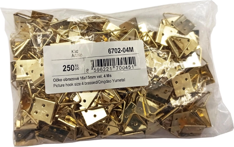 Praktyczne oczko obrazowe do niezawodnego zawieszania ram i fotografii. Wymiary 16 × 15 mm, rozmiar 4, wykonanie z mosiądzu dla długiej żywotności i eleganckiego wyglądu. Opakowanie 250 szt. idealne do warsztatów, pracowni ramiarskich i użytku domowego. Łatwy montaż poprzez wbicie w tylną stronę drewnianej ramy.
