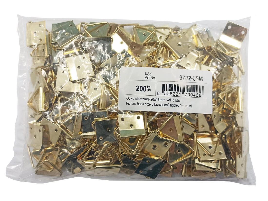Ucho obrazowe 20 × 18 mm w rozmiarze 5 z wytrzymałego mosiądzu jest idealne do wieszania obrazów i fotografii na ścianie. Praktyczne opakowanie 200 szt. ułatwia montaż wielu ram i zapewnia mocne oraz bezpieczne mocowanie.