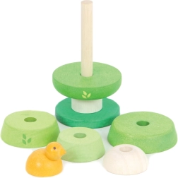 Sześć zielonych pierścieni w różnych odcieniach rozwija małą motorykę, koordynację oko–ręka i pomaga dzieciom uczyć się kolorów oraz rozmiarów.