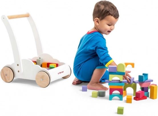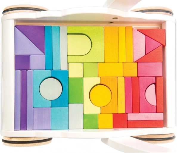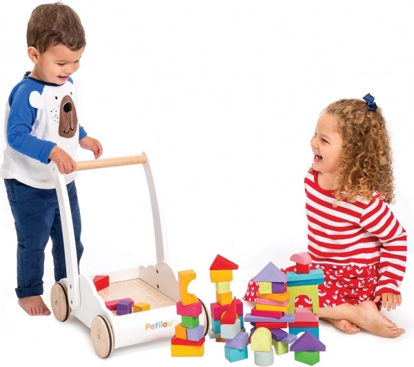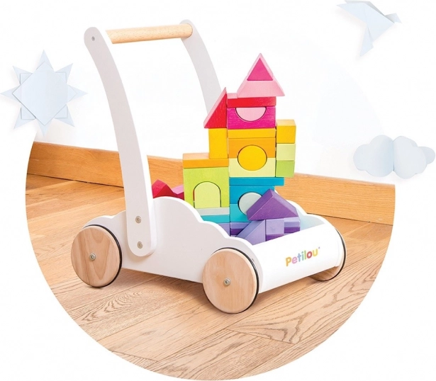 Wózek z tęczowymi klockami Petilou został zaprojektowany, aby dodać dzieciom pewności siebie i stabilności podczas stawiania pierwszych kroków. Wyposażony w 45 klocków w różnych odcieniach tęczy, wspiera rozwój wyobraźni przestrzennej, zręczności i motoryki.