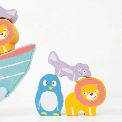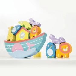 To pięknie kolorowa balansująca arka zawiera dziesięć ręcznie malowanych zwierzątek, które dzieci umieszczają na łódce, wzmacniając swoją koordynację ręka-oko i zręczność. Zestaw tych zwierzątek i łódki wykonany jest z odnawialnego drewna FSC i pomalowany jest nietoksycznymi farbami na bazie wody.