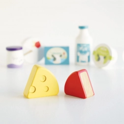 Wzbogać dziecięcą zabawę o drewnianą skrzynkę z produktami mlecznymi, która zawiera mleko, masło, jogurt i sery. Świetna do rozwijania wyobraźni i motoryki.