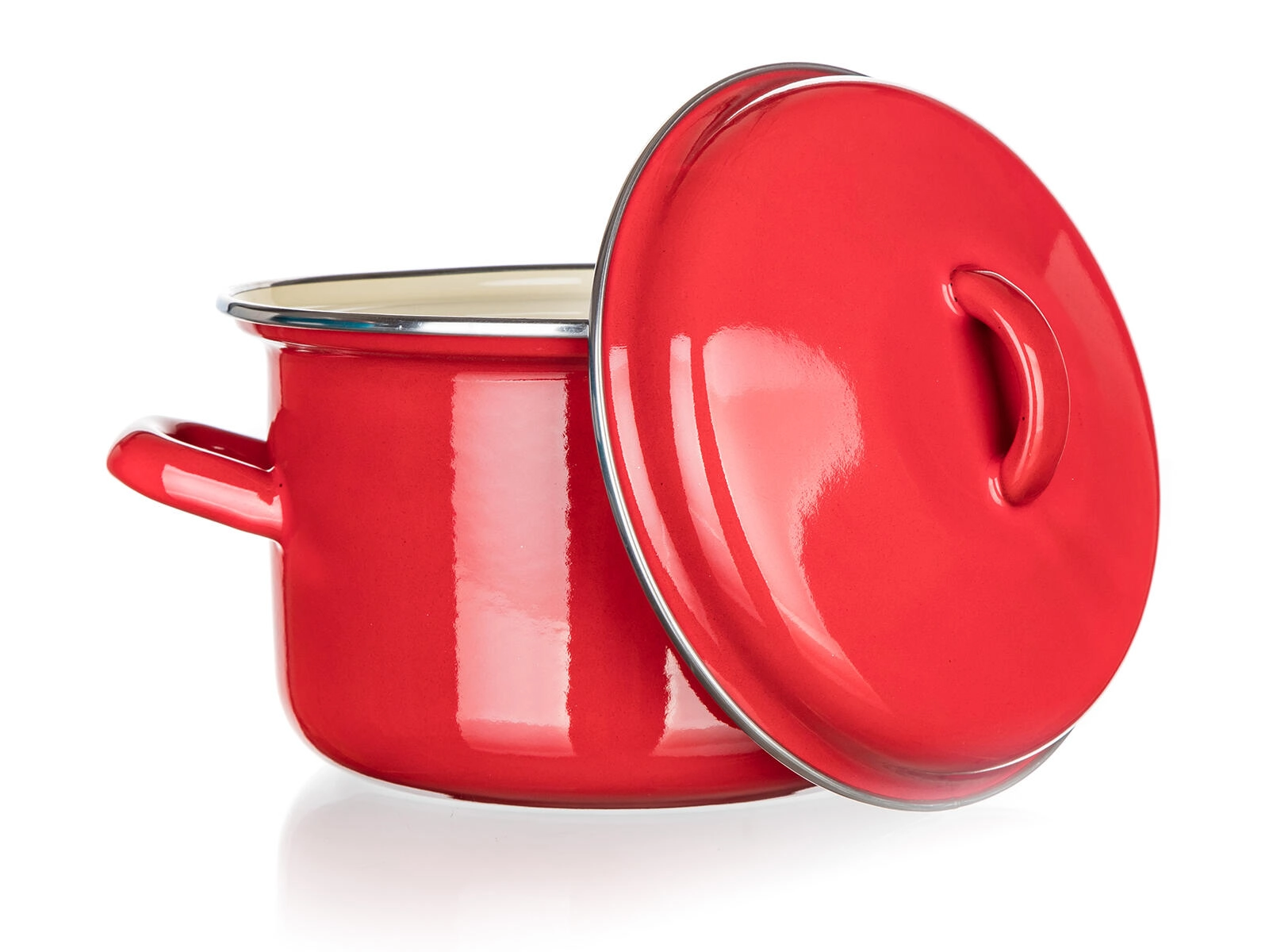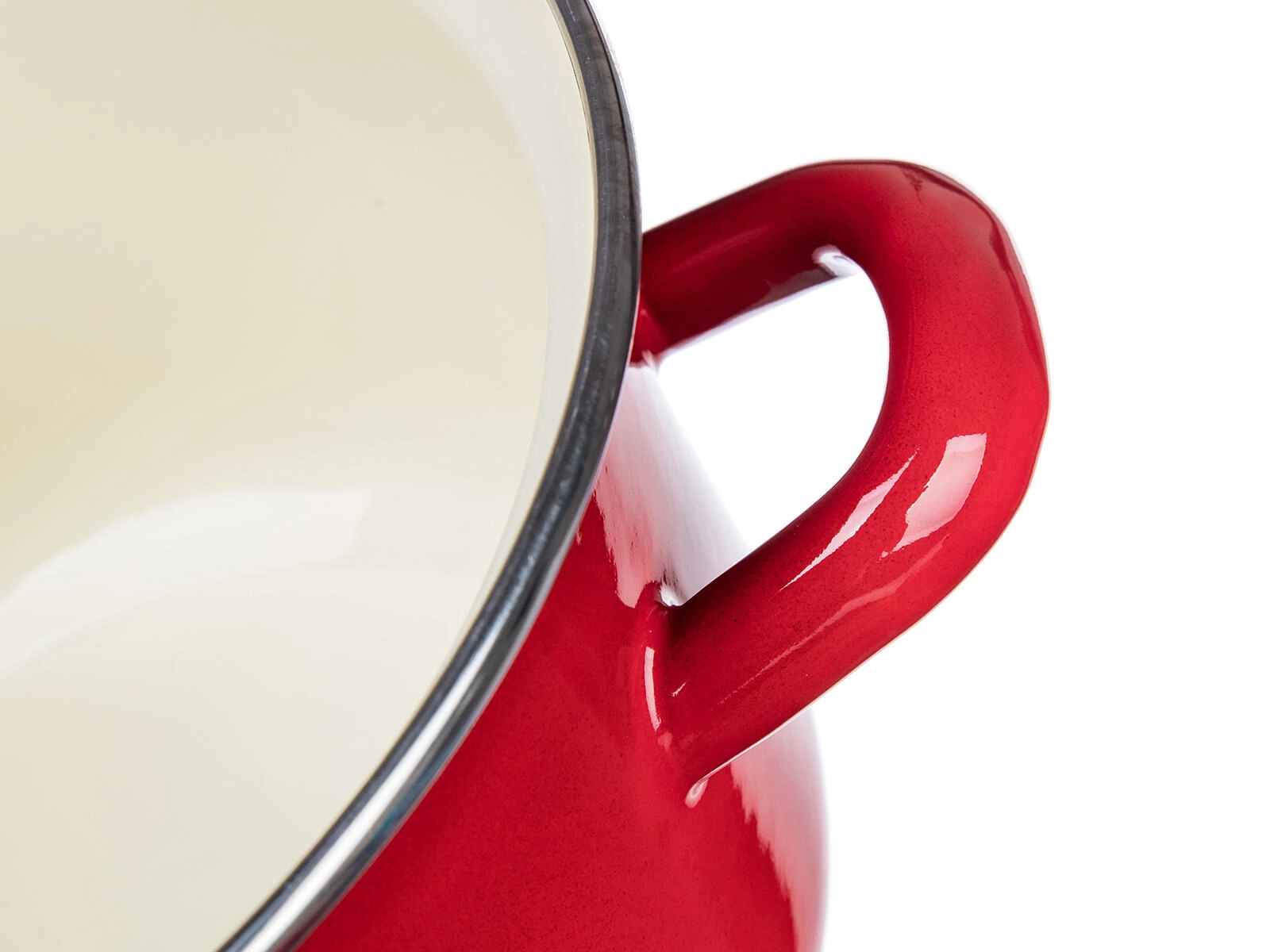 Czerwona emalia na zewnątrz i kremowe wnętrze są odporne na plamy i ułatwiają pielęgnację. Powierzchnia jest gładka, higieniczna i odporna na blaknięcie.